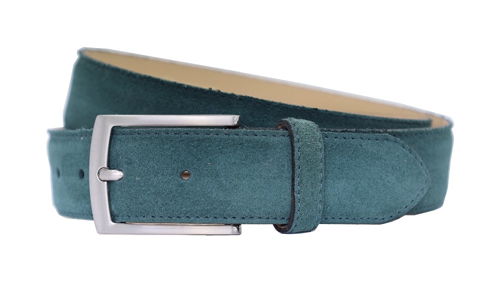 3.5cm brede groen-blauwe riem van echt suede leer.