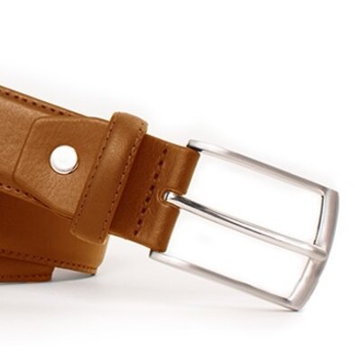 Mooie cognac riem van Italiaans leer en nikkelvrije gesp. 35mm brede rond gestikte riem waardoor deze riem niet alleen in een pak past maar ook prima te combineren met een casual outfit.